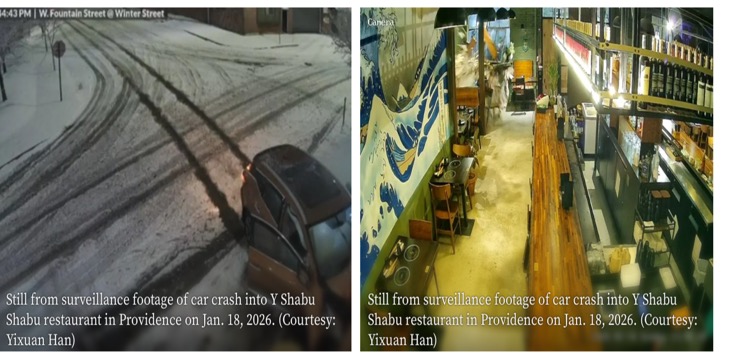 La policía acudió a West Fountain Street la noche del domingo después de que un vehículo impactara a Y Shabu Shabu, un popular restaurante asiático en Federal Hill, según un portavoz municipal. Las imágenes de vigilancia proporcionadas por el propietario, Yixuan Han, muestran los momentos previos al accidente, alrededor de las 23:45. Se puede ver una camioneta naranja circulando a toda velocidad por Winter Street, que estaba cubierta de nieve, antes de estrellarse contra el edificio y chocar contra un árbol. En el momento del impacto se escucha un fuerte estruendo y estruendos. Las imágenes del interior del restaurante muestran cómo el vehículo atraviesa una pared, destrozando ventanas y ladrillos, haciendo volar muebles y levantando nubes de polvo.