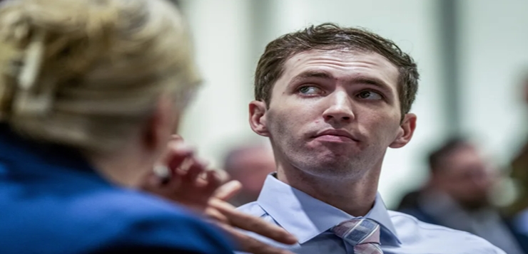 Vestido con una camisa azul clara y pantalones de mezclilla, el joven lucía calmado al hablar con sus abogados antes del comienzo de la audiencia.