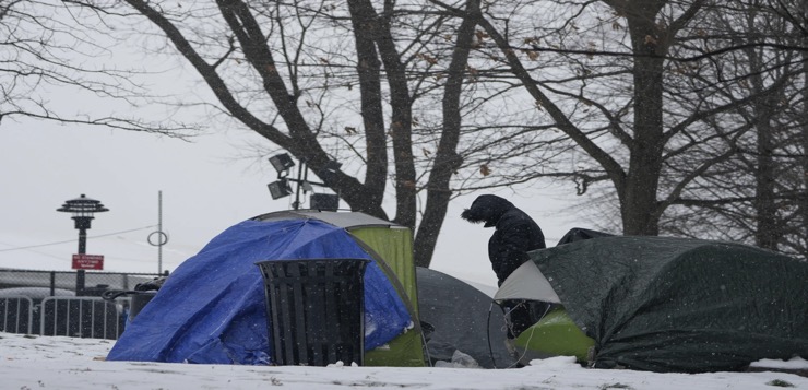 Así que afuera de las puertas del complejo, un puñado de personas han colocado sus propias tiendas de campaña en medio de las bajas temperaturas invernales. Muchas ya agotaron el tiempo en el que se les permite estar en el sistema oficial de albergues de la ciudad y no han podido conseguir otro espacio en el programa ni encontrar un lugar propio.