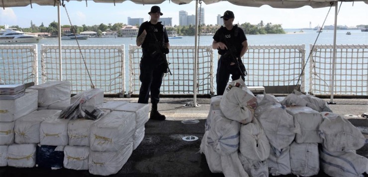 La droga decomisada por embarcaciones de los guardacostas estadounidense, dos helicópteros y un buque de la Armada Real de los Países Bajos se descargó hoy en el Puerto de los Everglades, al norte de Miami, en Florida.