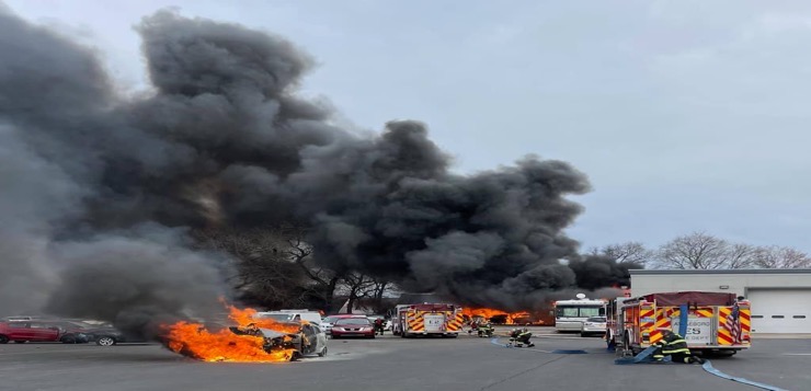 Los bomberos dijeron que comenzó en una casa rodante y se extendió rápidamente a otros 40 autos en el patio. “Sterry Street Towing es una empresa de remolque bastante grande en esta área, y tienen varios vehículos destrozados estacionados allí. Originalmente, dos campistas estuvieron muy involucrados en el incendio”, dijo Dave Cairrao, jefe del batallón de Pawtucket.