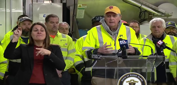 McKee ofreció una rueda de prensa en las instalaciones de mantenimiento del Departamento de Transporte de Rhode Island en Smithfield, donde se reunió con los conductores de las quitanieves.