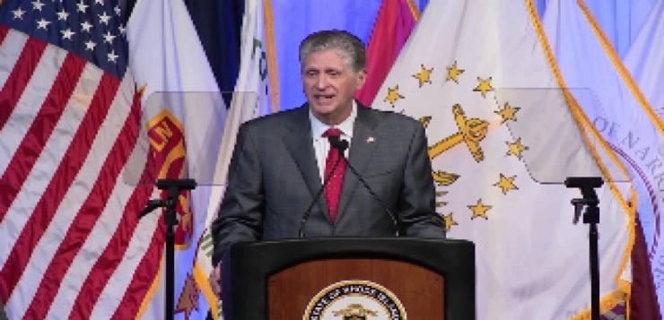 El gobernador comenzó su discurso con  un momento de silencio por Lincoln Almond, exgobernador republicano de Rhode Island durante dos mandatos y fiscal federal durante mucho tiempo en el estado, quien falleció el lunes.