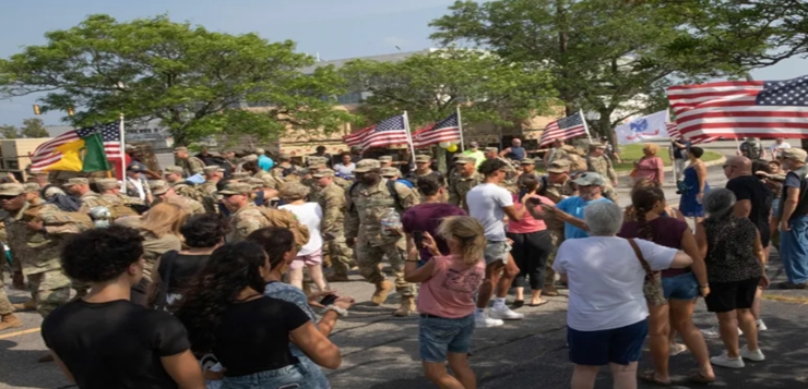 Fueron recibidos por líderes estatales y de la Guardia Nacional, luego marcharon por Airport Road hasta la armería donde se reunieron con familiares y amigos.