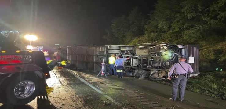 El choque ocurrió en medio de una intensa lluvia en torno a las 23:50 del domingo en el sentido sur de la Interestatal 81 en el municipio de Lower Paxton, en el condado Dauphin, cerca de Harrisburg, según la policía del estado. El autobús chocó contra una barrera lateral, golpeó la parte trasera de un auto y se quedó sobre un costado.