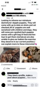 La policía dijo que las cuentas en Facebook Marketplace enumeraban cachorros Dachshund y Bulldog para la venta utilizando información de las identidades reales de los residentes y solicitaban que se les pagara electrónicamente.