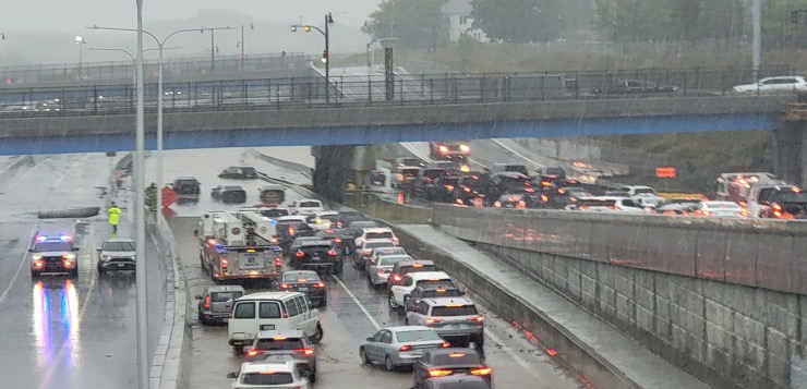A partir de las 6 p. m., el tráfico fluía nuevamente a ambos lados de la I-95. La carretera se cerró por completo debido a las fuertes inundaciones en el área de la Salida 18 (Thurbers Avenue) en Providence, dejando a algunos conductores varados durante horas.