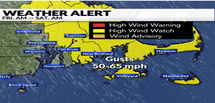 Providence – El Servicio Meteorológico Nacional emitió una alerta por fuertes vientos para el viernes, ya que es probable que las ráfagas alcancen las 50 a 65 mph. También hay una vigilancia de inundaciones costeras. Es muy probable que se produzcan inundaciones menores para las comunidades costeras vulnerables debido a las mareas altas y la acción de las olas.