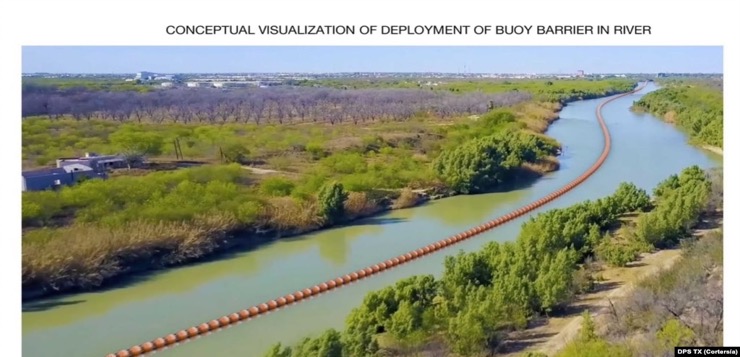 La barrera flotante es una de las múltiples estrategias que el gobernador republicano Greg Abbott ha lanzado para disuadir a los migrantes, incluidas bobinas de alambre de púas colocadas a lo largo de la orilla del río.